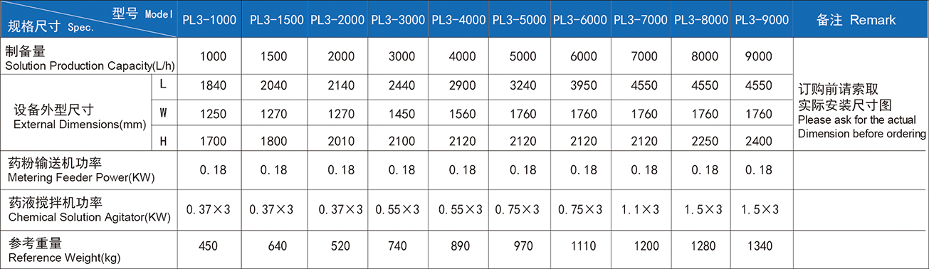 Sistem persiapan bubuk tiga kotak otomatis PL3 dibagi menjadi tangki pembubaran, tangki curing dan tangki penyimpanan. Itu dapat dikontrol secara manual atau otomatis. Sistem ini kompak dalam struktur, dapat dioperasikan secara otomatis, dan konsentrasi persiapan dapat disesuaikan.